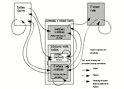 In the diagram, arrows indicate the direction of calls. For example, an arrow connecting Fortran classes with bodyless routines in External classes indicate calls in the regular Sather code to abstract routines in the external Fortran classes. The type of the arrow demonstrates that such calls are compiled using the Fortran style call name binding and parameter passing convention. On the other hand, calls from routines with bodies in the external Fortran classes into regular Sather classes are represented by a solid arrow which denotes the Sather call name binding and parameter passing convention.