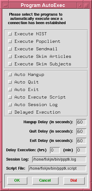 Well, I managed to get all those things set up. In addition, once a connection has been established, it starts a timer which indicates the online time -- AND, if a connection is up, iconizing the program causes the online time to be displayed in the icon's title.