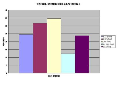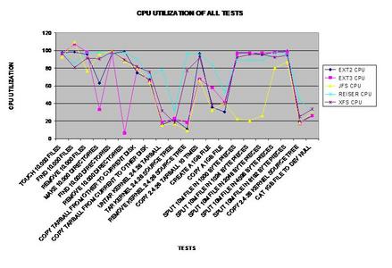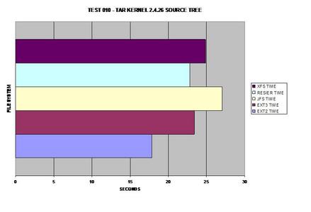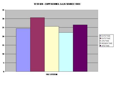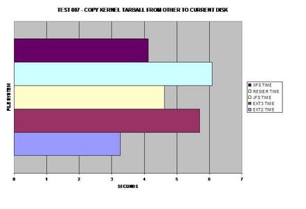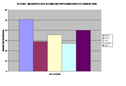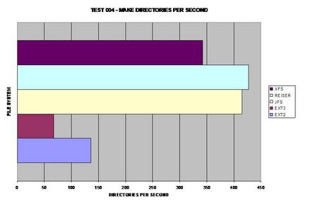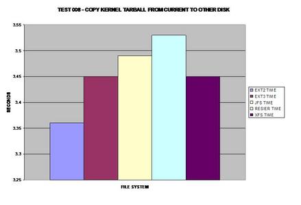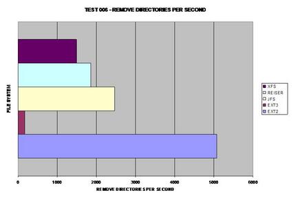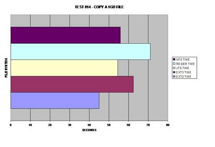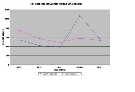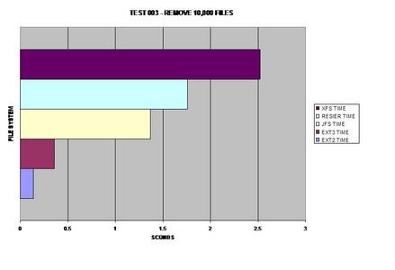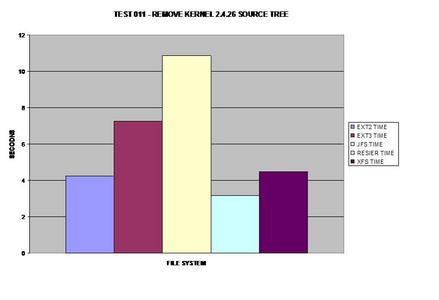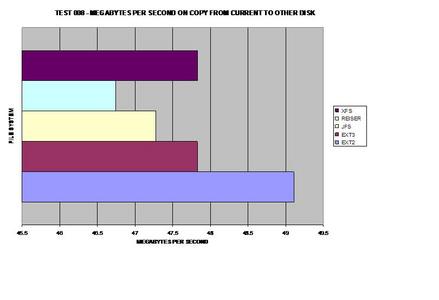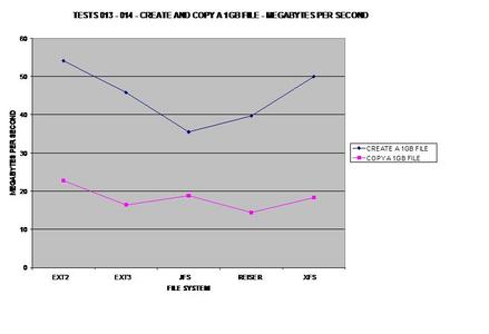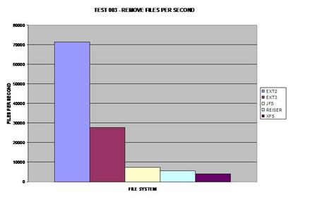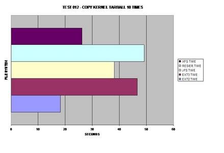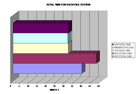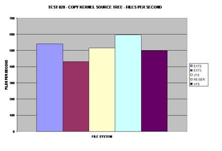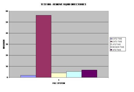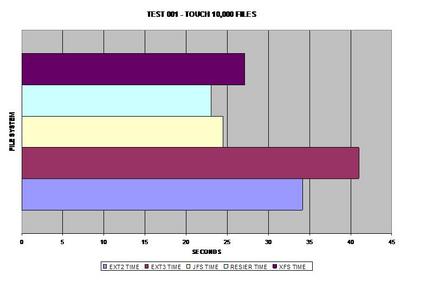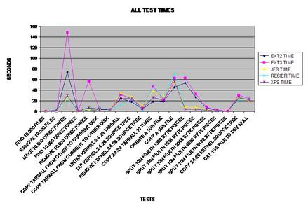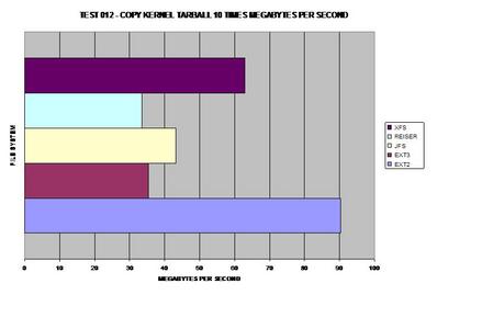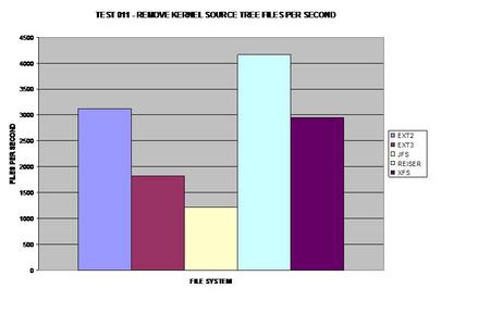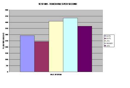 In the first test, ReiserFS takes the lead, possibly due to its balanced B-Trees. (If the images are hard to read on your screen, here's a tarball containing larger versions of them.)
