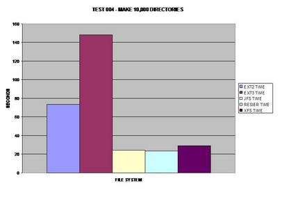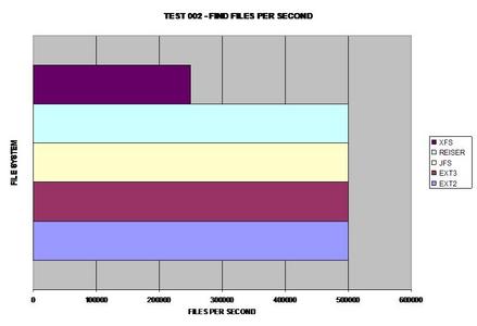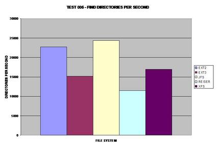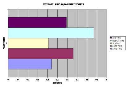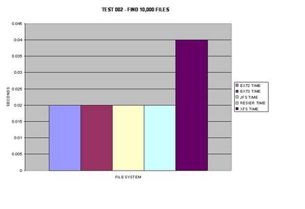 Finding 10,000 files seemed to be the same except for XFS; however directories are definitely handled differently between the tested file systems. Oddly enough, ReiserFS takes the largest performance hit in this area.