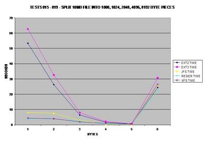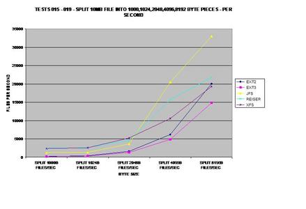 This test probably surprised me the most, so much so I re-ran the test several times and got consistent results each time. Both ext2 and ext3 have serious problems splitting files into small pieces, while JFS, ReiserFS and XFS do not seem to have a problem.