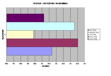 As expected, ext2 wins here because it does not journal any of the copied data. As many would suspect, XFS handles large files well and takes the lead for journaling file systems in this test.