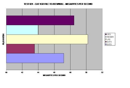 JFS takes this test benchmark by storm; I was surprised that it had performed so well. However, once again dealing with large files, XFS is a close second.