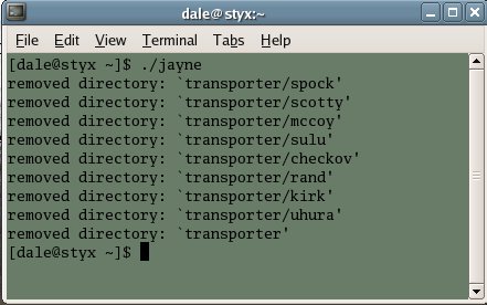 You can use the 'jayne' command file only with caution, like Adam Baldwin's character. 'jayne' is dangerous and will not care if you forgot to move the files off the transporter platform... he will simply kill them all and give them to the Reavers. You will not be able to recover them. If you want to watch Jayne and Vera do their evil work, you can use the '-v' option, and then you will see a listing as Jayne makes each kill.