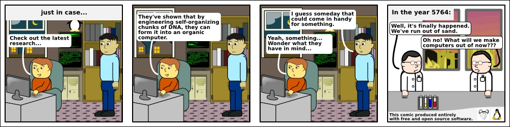 The webcomic Doomed to Obscurity was launched New Year's Day, 2009, as a "New Year's surprise". He has since rigorously stuck to a posting schedule of "every odd-numbered calendar day", which allows him to keep a steady pace without tiring. The tagline for the webcomic states that it "gives the geek culture just what it deserves." But is it skewering everybody but the geek culture, or lampooning geek culture itself, or doing both by turns?