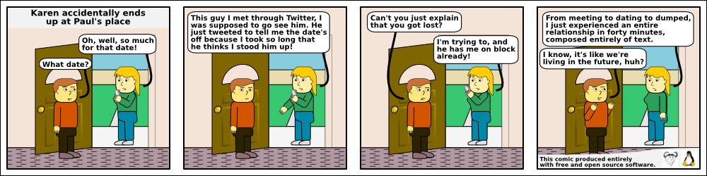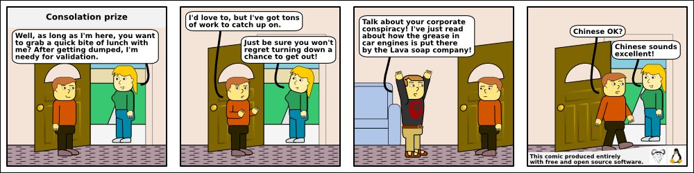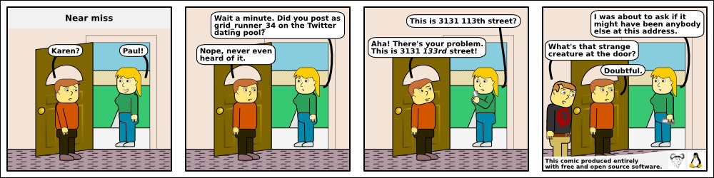 The webcomic Doomed to Obscurity was launched New Year's Day, 2009, as a "New Year's surprise". He has since rigorously stuck to a posting schedule of "every odd-numbered calendar day", which allows him to keep a steady pace without tiring. The tagline for the webcomic states that it "gives the geek culture just what it deserves." But is it skewering everybody but the geek culture, or lampooning geek culture itself, or doing both by turns?
