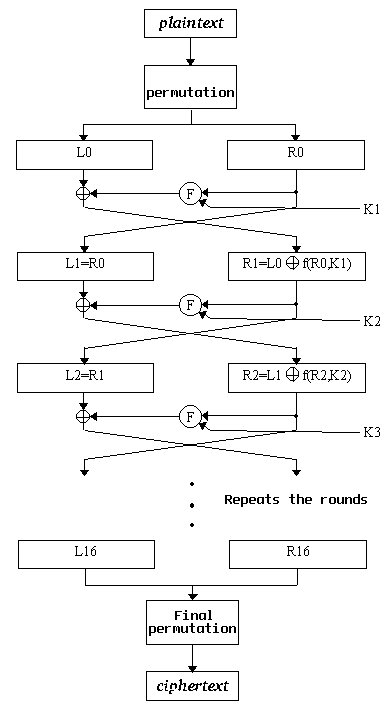 At its simplest level, the algorithm is based on two simple principles: diffusion and confusion. DES applies substitutions followed by permutations to a plaintext, based on a given key. This process is called round, and DES applies it 16 times. The following scheme represents a more detailed look of DES.