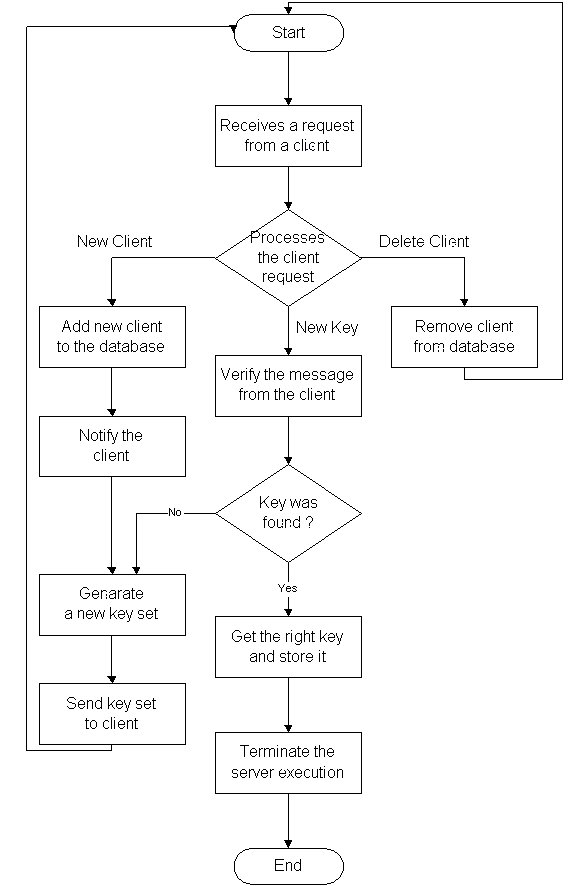 One of the main functions of a server is to wait and receive requests from a client. The DES key server has the same behaviour. The server starts, waits and processes requests. In order to communicate with the clients it is necessary to have some network functionality's. In this case, the server receives requests from the clients through RMI. RMI was chosen, because it adds a layer of abstraction between the Java program and the network complexities.