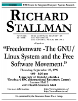 About a month ago, while checking out the VLUG links page I happen to stumble across the linux.bc.ca website. Just in time as it turns out, since Richard Stallman is scheduled to talk on "Freedomware: The GNU/Linux System and the Free Software Movement" in Vancouver at the University of British Columbia on Thursday, September 23. As an added bonus, Tim O'Reilly is speaking on Friday, so if I stay I'm thinking I'll get the full spectrum of opinions on free software and documentation. Flash forward to...