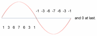 The numbers represent how loud the noise gets at every instant. You're involuntarily doing DSP here. DSP is a year two pain-in-the-neck paper for most Electrical Engineering undergraduates. (I'm one of them. Accept my hearty condolences.) So I'd better mention that you're actually looking at samples. These values are all you need to recreate the wave we need. Do that continuously, and you have a continuous wave. So if we ran through the numbers starting at 1 through 7 through 0 through -1 through -7 through -1 to 0, all in a second, we'd get a very approximate sine wave at 1Hz. (Remember, Hertz is cycles per second.) Got the mechanics of the thing? Want a sine wave with a smoother curve? Just increase the number of samples you take per second. Here we've done 14. How about if it were 44000? That's the rate a CD player spews the numbers out to its DAC. DAC stands for Digital to Analog Converter, it's the little gadget that converts the 1s and 0s that make up the binary numbers that we are talking about into real analog time-varying voltage. Our little coding technique is called pulse code modulation. There are different ways to code the pulses, so we have PCM, ADPCM etc. The waveform above could be termed "4bit, signed mono PCM at 14Hz" sampling rate.