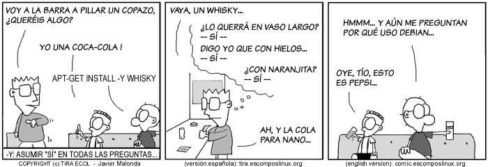 These cartoons were made for es.comp.os.linux (ECOL), the Spanish USENET newsgroup for Linux. The strips are drawn in Spanish and then translated to English by the author. Text commentary on this page is by LG Editor Iron. Your browser has shrunk the images to conform to the horizontal size limit for LG articles. For better picture quality, click on each cartoon to see it full size.