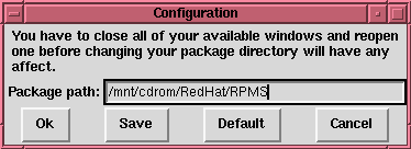 To change this path, first be sure to close all of the windows listing available packages you may have open. Then choose the Configuration option from one of the remaining windows. This will open a dialog box like the one shown in figure 72. Here you can type the full path to the RPMs you'd like to look at. Choosing the Save button will save this path, making it the default for future glint sessions. The Default button restores the path to the one that glint used when it started.