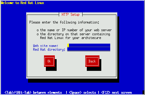 Enter the name or IP address of the HTTP site you are installing from, and the name of the directory there which contains the RedHat directory for your architecture. For example, if the HTTP site contains the directory /pub/mirrors/redhat/i386/RedHat, enter /pub/mirrors/redhat/i386.