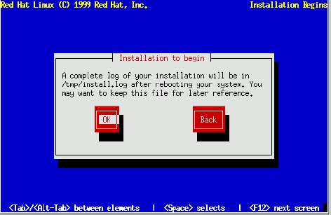 Figure 8-40 appears when the install program is ready to format partitions and load software packages. The dialog names the log file (/tmp/install.log) for this Red Hat Linux installation. Select Ok and press Space to continue.