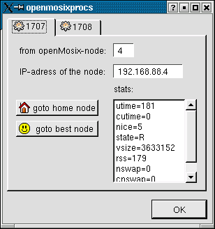 The openMosixview-migrator window displays all nodes in your openMosix-cluster. This window is for managing one process (with additional status-information). By double-clicking on an host from the list the process will migrate to this host. After a short moment the process-icon for the managed process will be green, which means it is running remote.