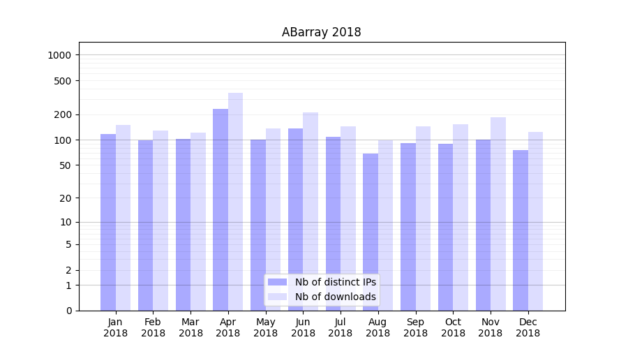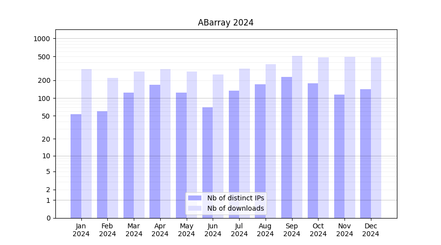 Number of downloads for software package ABarray, year by year, from 2025 back to 2014 (years with no downloads are omitted):