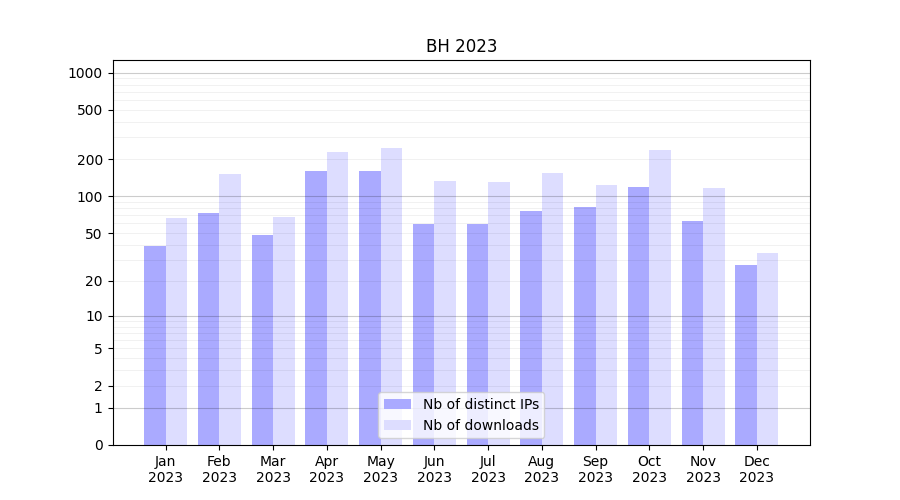 Number of downloads for software package BH, year by year, from 2025 back to 2014 (years with no downloads are omitted):