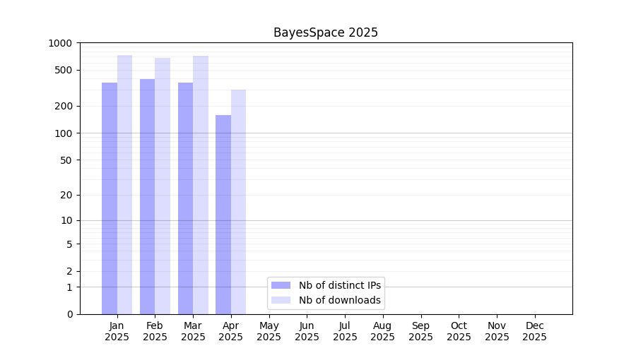Number of downloads for software package BayesSpace, year by year, from 2025 back to 2014 (years with no downloads are omitted):