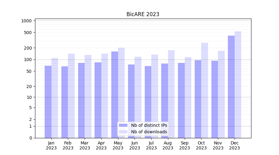 Number of downloads for software package BicARE, year by year, from 2025 back to 2014 (years with no downloads are omitted):