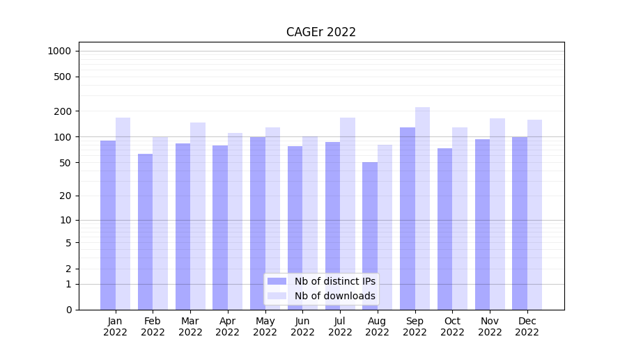 Number of downloads for software package CAGEr, year by year, from 2025 back to 2014 (years with no downloads are omitted):