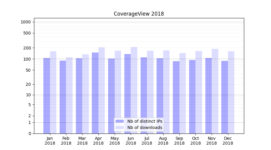 Number of downloads for software package CoverageView, year by year, from 2025 back to 2014 (years with no downloads are omitted):
