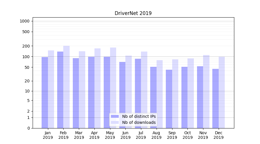 Number of downloads for software package DriverNet, year by year, from 2025 back to 2014 (years with no downloads are omitted):