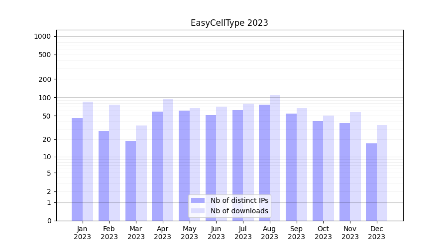 Number of downloads for software package EasyCellType, year by year, from 2025 back to 2014 (years with no downloads are omitted):