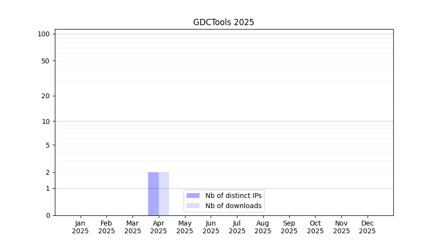 Number of downloads for software package GDCTools, year by year, from 2025 back to 2014 (years with no downloads are omitted):
