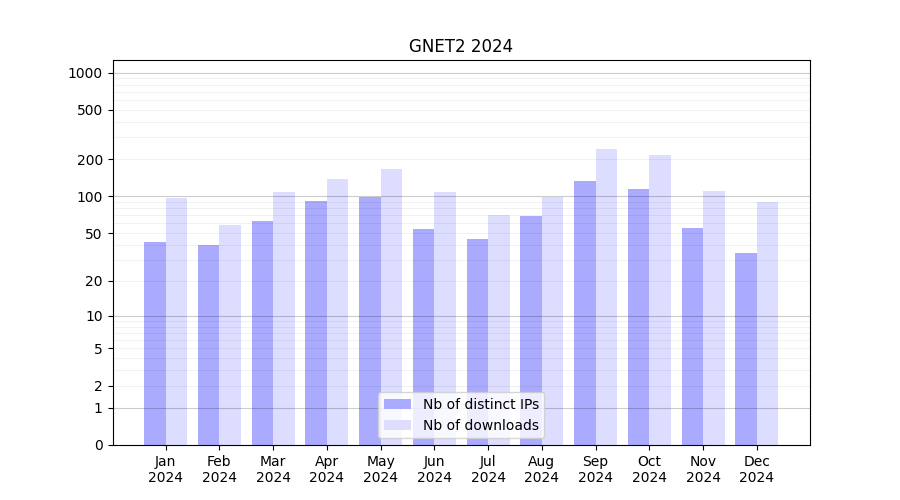 Number of downloads for software package GNET2, year by year, from 2025 back to 2014 (years with no downloads are omitted):