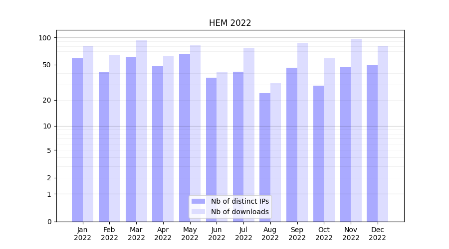 Number of downloads for software package HEM, year by year, from 2025 back to 2014 (years with no downloads are omitted):