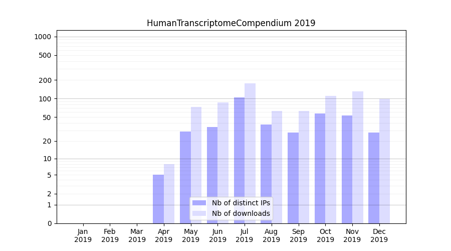 HumanTranscriptomeCompendium_2019_stats.tab| Month | Nb of distinct IPs | Nb of downloads |