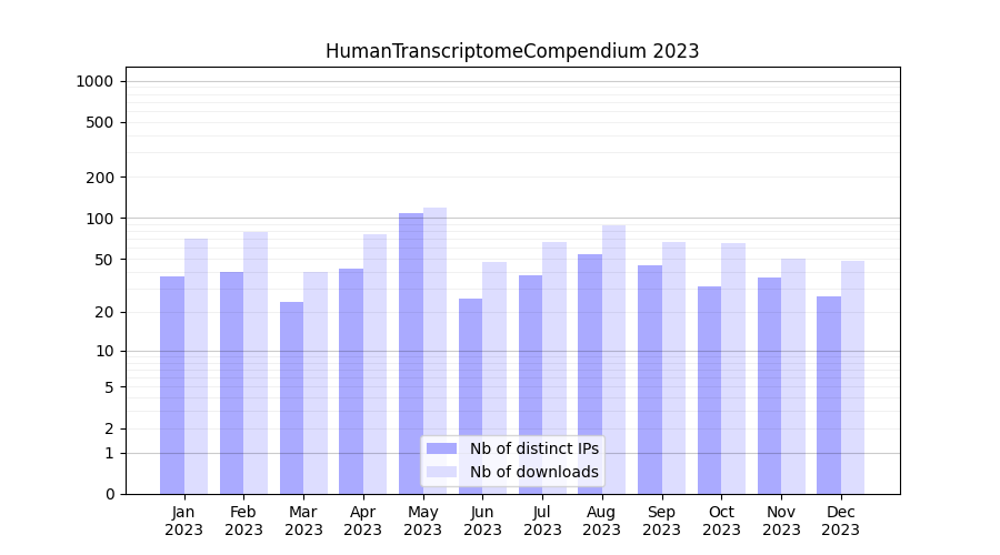 HumanTranscriptomeCompendium_2023_stats.tab| Month | Nb of distinct IPs | Nb of downloads |