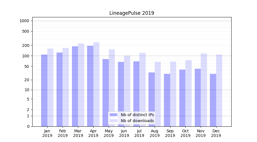 LineagePulse_2019_stats.tab| Month | Nb of distinct IPs | Nb of downloads |