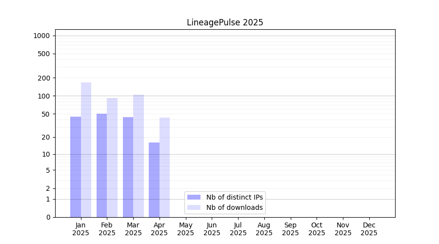 LineagePulse_2025_stats.tab| Month | Nb of distinct IPs | Nb of downloads |