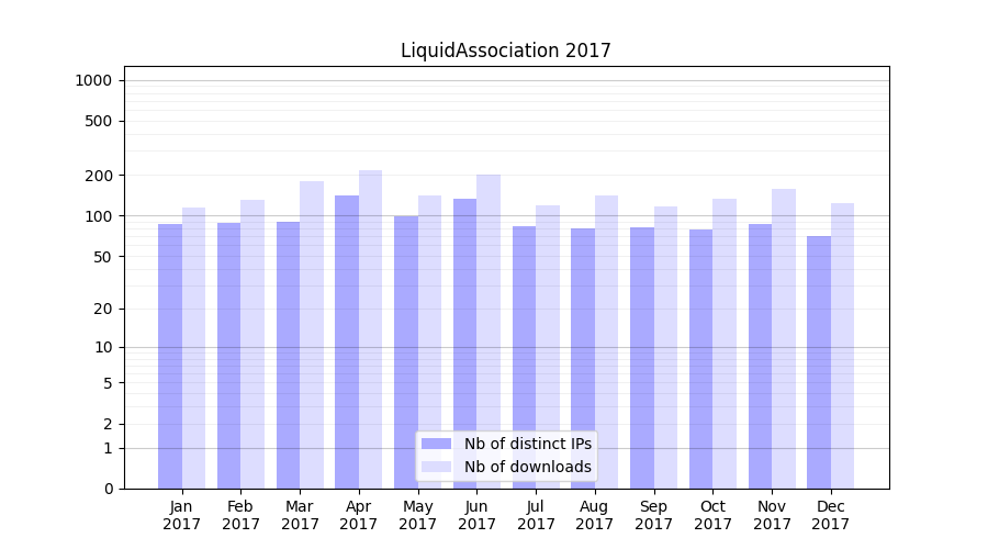 Number of downloads for software package LiquidAssociation, year by year, from 2025 back to 2014 (years with no downloads are omitted):