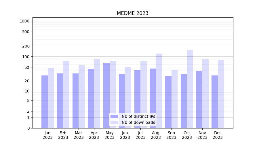 Number of downloads for software package MEDME, year by year, from 2025 back to 2014 (years with no downloads are omitted):