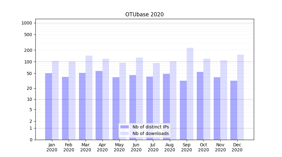 Number of downloads for software package OTUbase, year by year, from 2025 back to 2014 (years with no downloads are omitted):