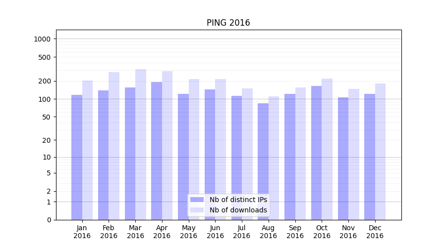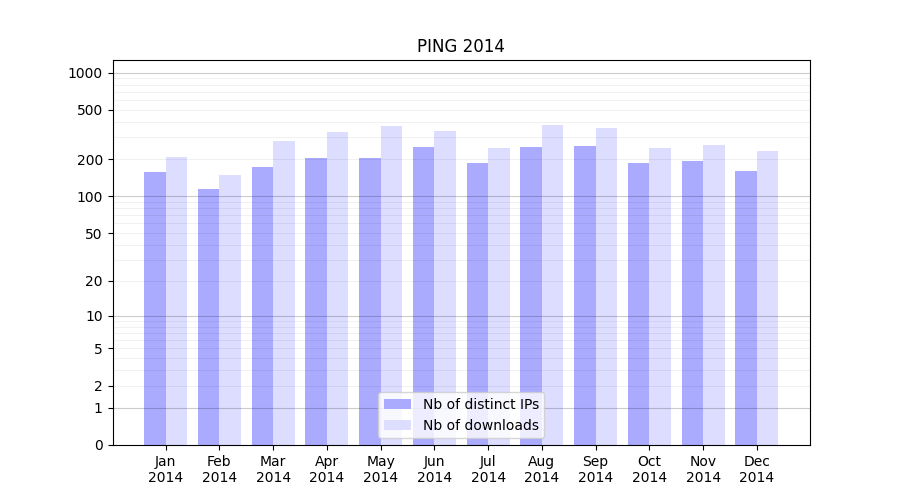 Number of downloads for software package PING, year by year, from 2025 back to 2014 (years with no downloads are omitted):