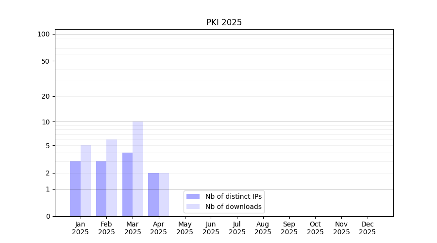 Number of downloads for software package PKI, year by year, from 2025 back to 2014 (years with no downloads are omitted):