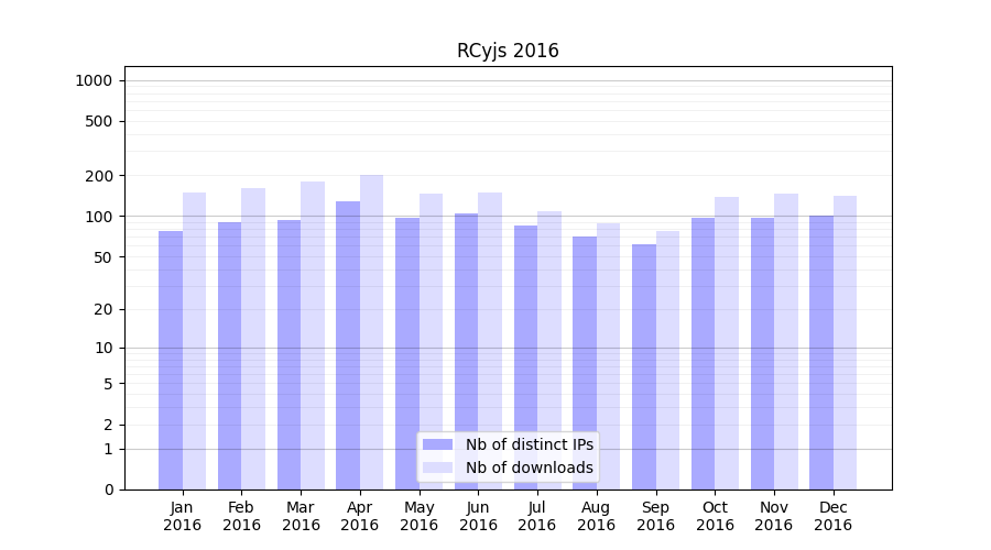 Number of downloads for software package RCyjs, year by year, from 2025 back to 2014 (years with no downloads are omitted):