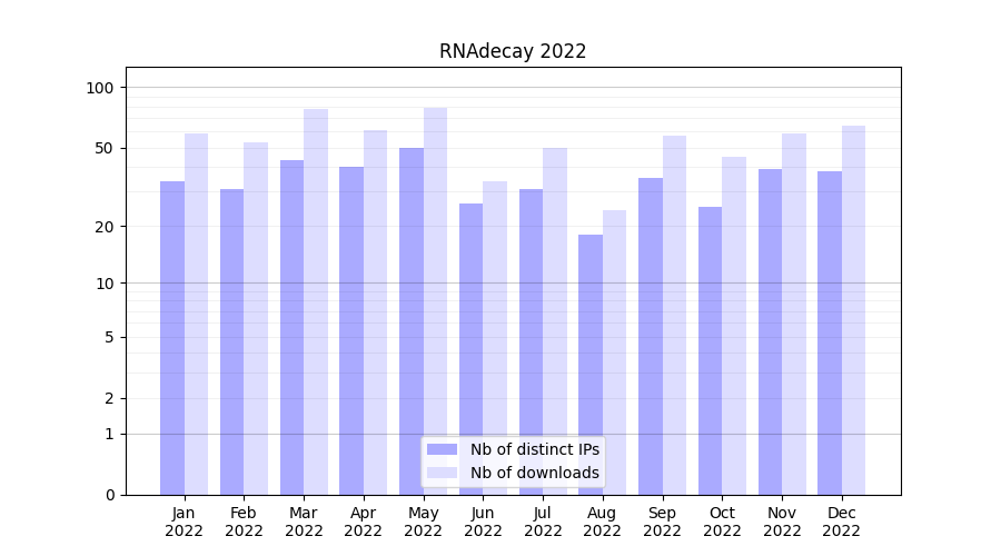 Number of downloads for software package RNAdecay, year by year, from 2025 back to 2014 (years with no downloads are omitted):