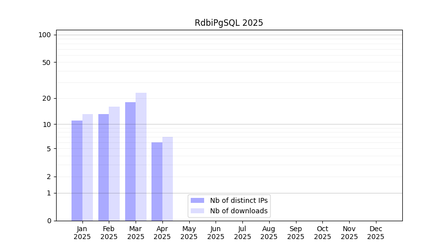 Number of downloads for software package RdbiPgSQL, year by year, from 2025 back to 2014 (years with no downloads are omitted):