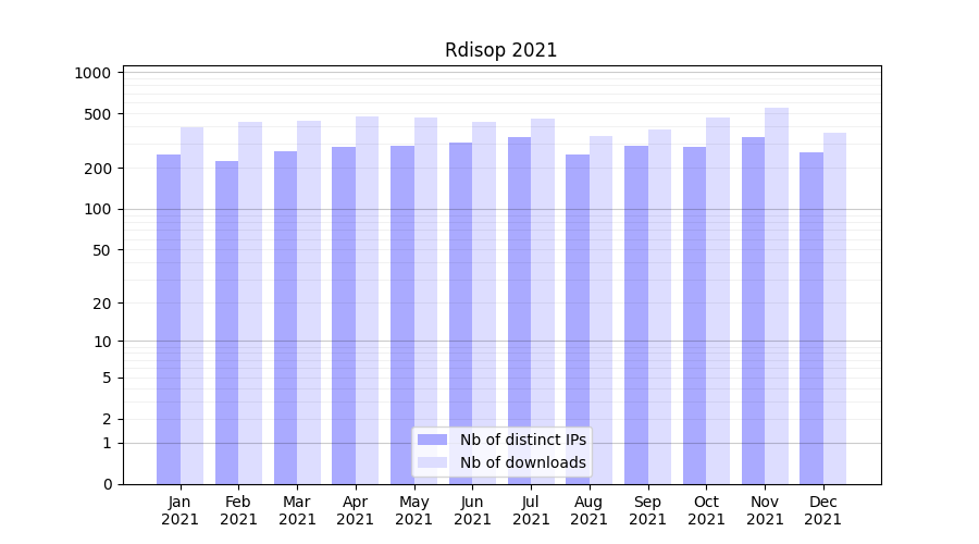 Number of downloads for software package Rdisop, year by year, from 2025 back to 2014 (years with no downloads are omitted):