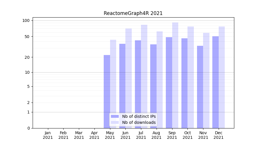 ReactomeGraph4R_2021_stats.tab| Month | Nb of distinct IPs | Nb of downloads |