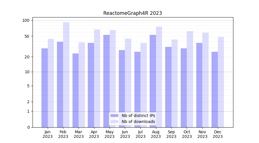 ReactomeGraph4R_2023_stats.tab| Month | Nb of distinct IPs | Nb of downloads |