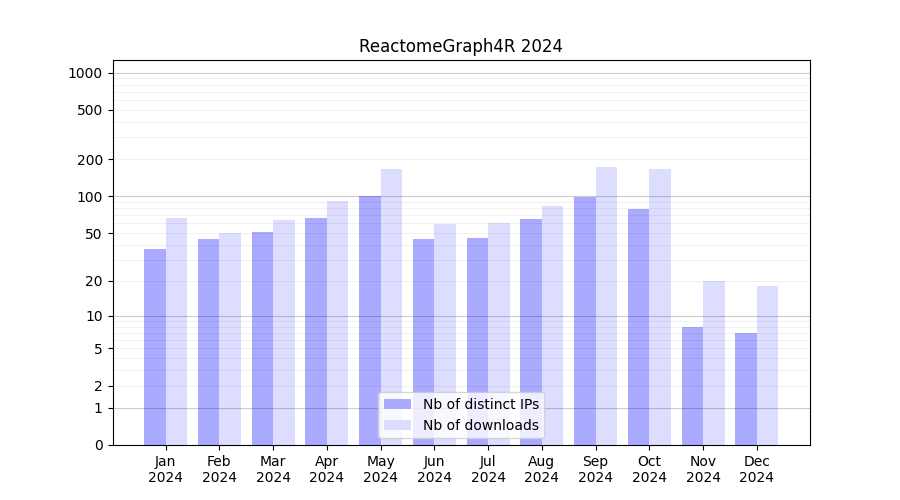 ReactomeGraph4R_2024_stats.tab| Month | Nb of distinct IPs | Nb of downloads |
