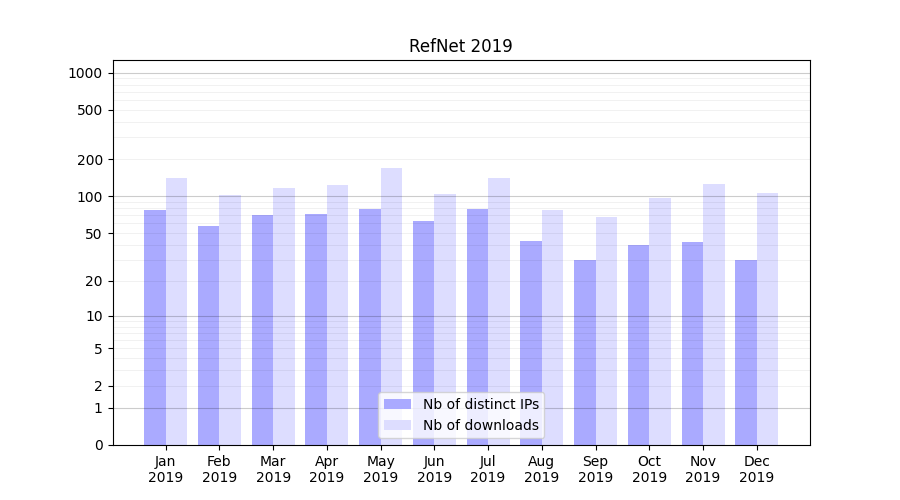 Number of downloads for software package RefNet, year by year, from 2025 back to 2014 (years with no downloads are omitted):