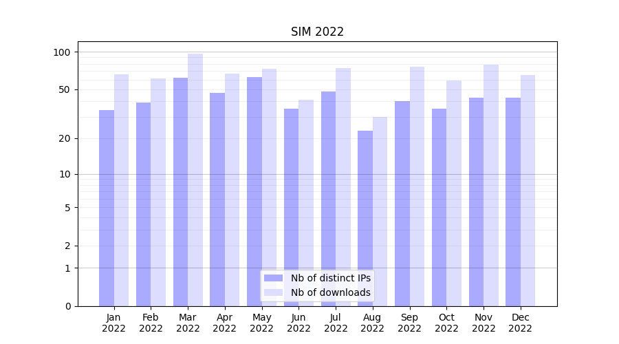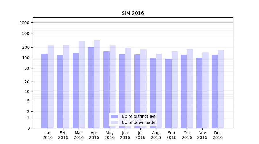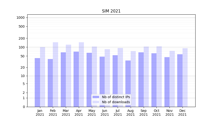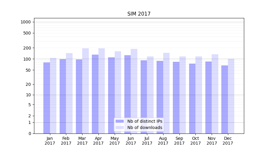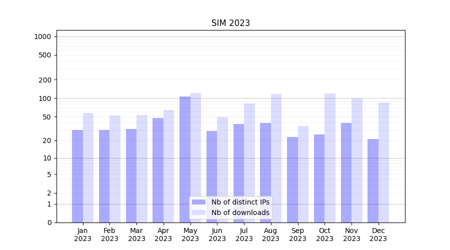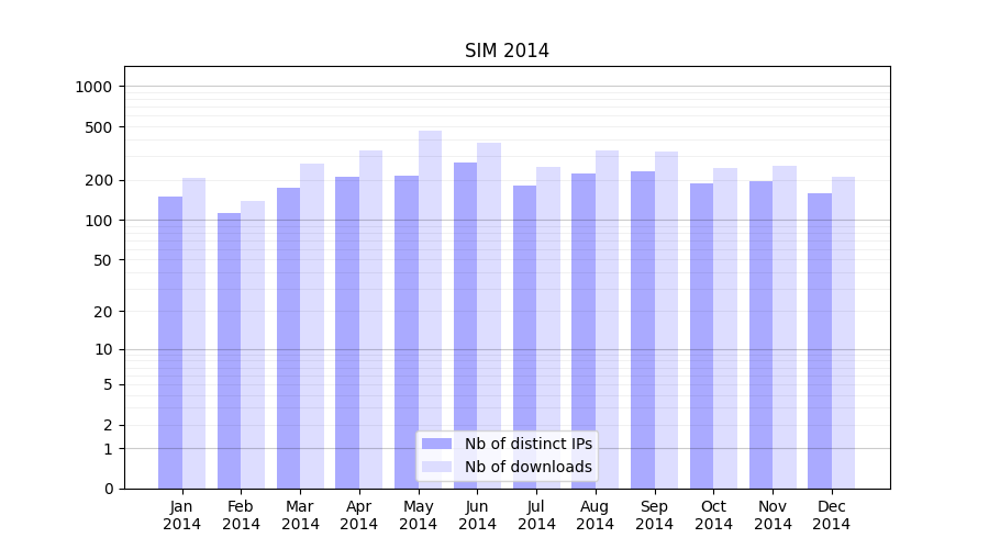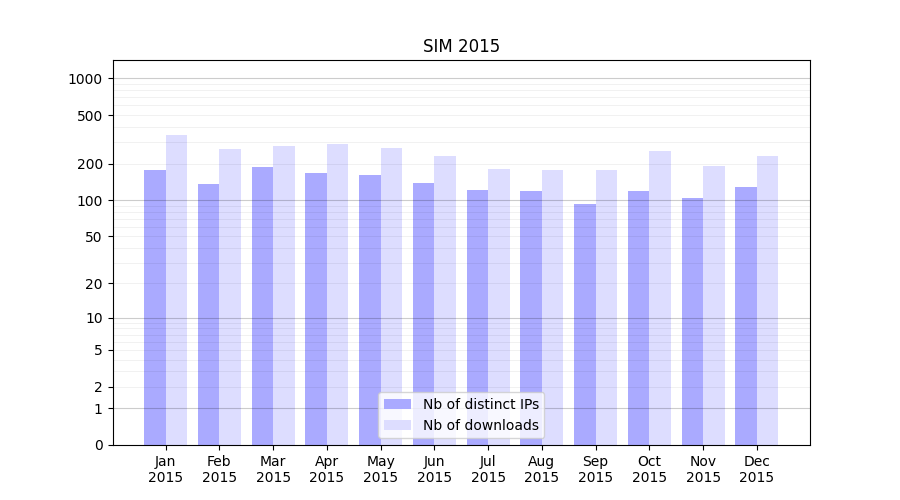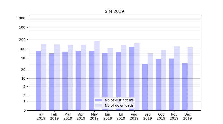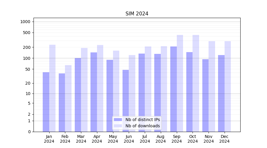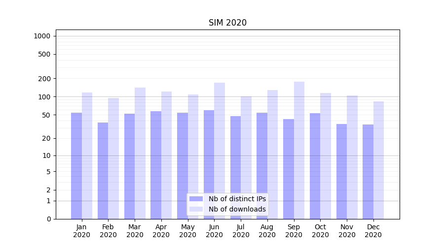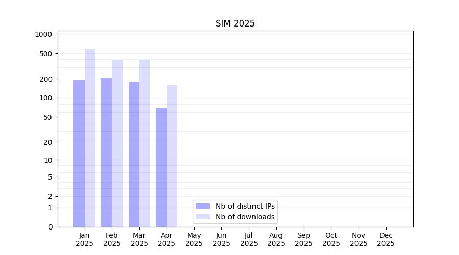Number of downloads for software package SIM, year by year, from 2025 back to 2014 (years with no downloads are omitted):