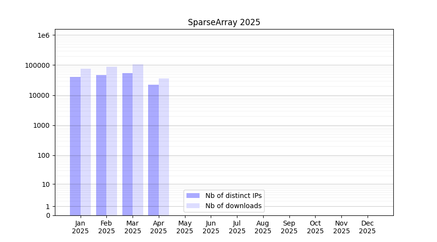 Number of downloads for software package SparseArray, year by year, from 2025 back to 2014 (years with no downloads are omitted):