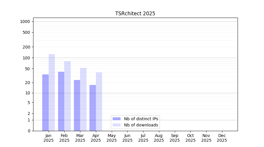 Number of downloads for software package TSRchitect, year by year, from 2025 back to 2014 (years with no downloads are omitted):